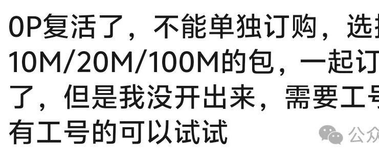 海绵宝宝提供的线报:0P复活了,不能单独订购,选择一个0元10M/20M/100M的包,一起订购,就可以了,但是我没开出来,需要工号开,有工号的可以试试!