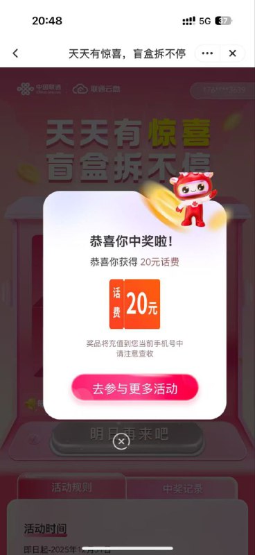 来,抽奖了,联通云盘,有三个抽奖地方,20元话费,五个号, 中了三个20,一个腾讯视频